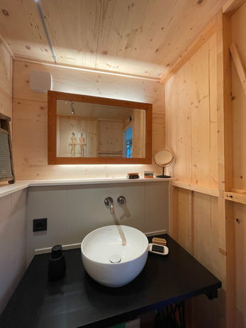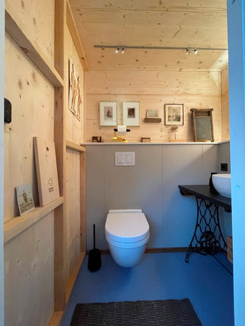 Mit der Badebox haben wir einen Ort geschaffen, der es mitten in der Revitalisierung erlaubt, länger hier zu bleiben, um alles ganz in Ruhe in sich aufzunehmen. Mit dem Blick auf unsere wunderschöne alte Eibe könnt ihr den Alltag vergessen und Euch in ein kleines Naturparadies hineinträumen.